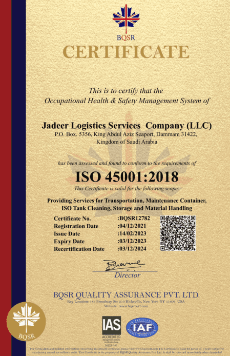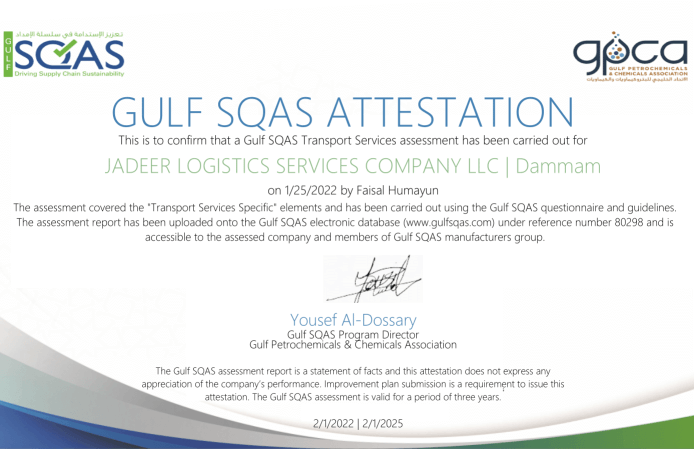 JADEER LOGISTICS, previously known as Al Muhaidib Land Transport , provides its clientele with a full range of logistical, Marine, Terminal Solutions, Tank Management ( Maintenance and Cleaning), Freight Management at a global level covering 100 plus countries to include Sea freight , Air freight , Pan GCC transport solutions, Project Cargo management, Value added services (VAS) such as Customs brokerage, Warehousing solutions, Kitting, packing, stripping of containers and various associated services.